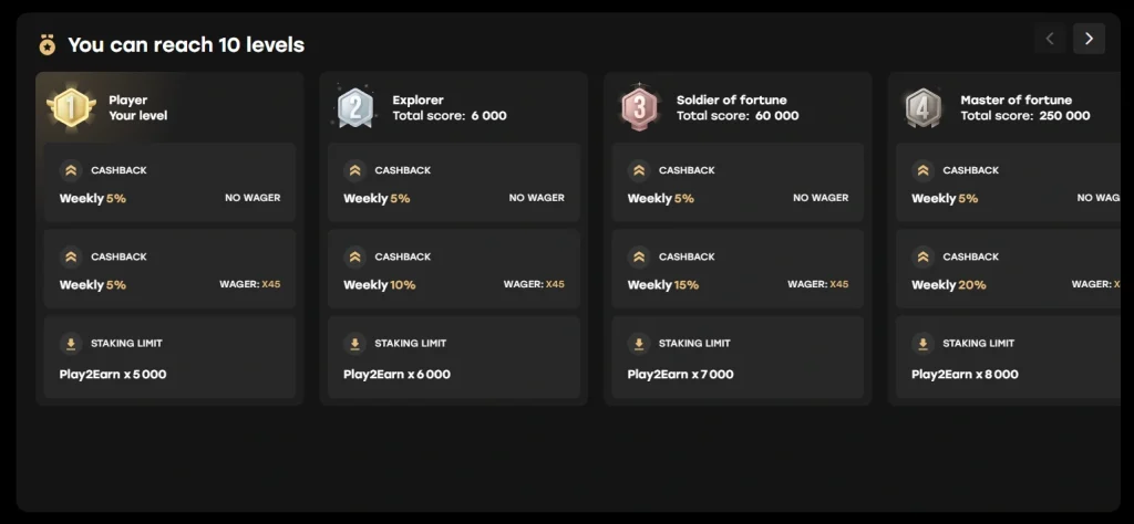 - Play to Earn (Juega para Ganar): Cada apuesta que realizas, ya sea que ganes o pierdas, te recompensa con TFS Tokens. Esta es una forma de rakeback permanente, lo que significa que siempre estás ganando algo de regreso, sin importar el resultado del juego.